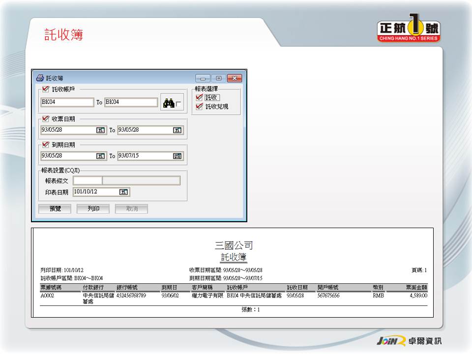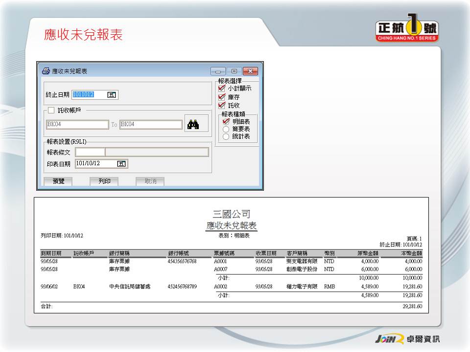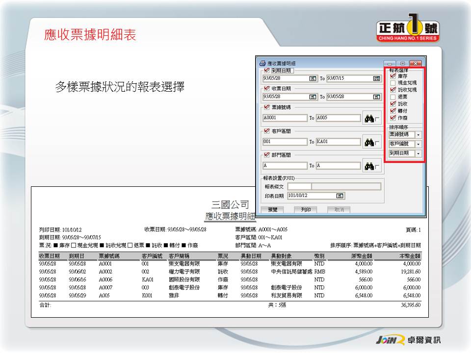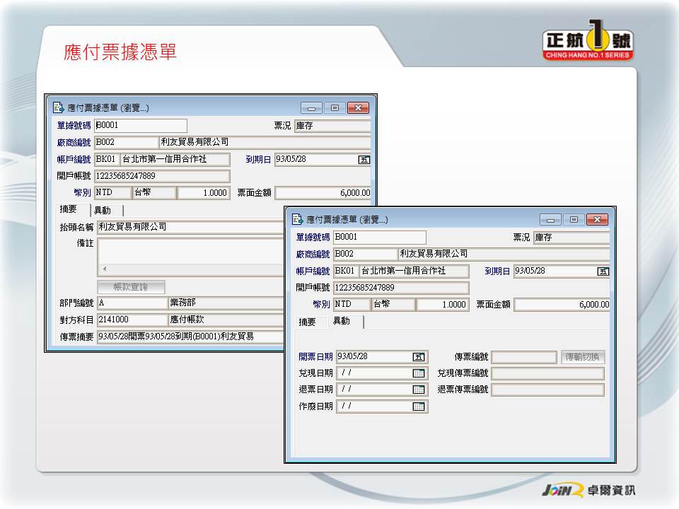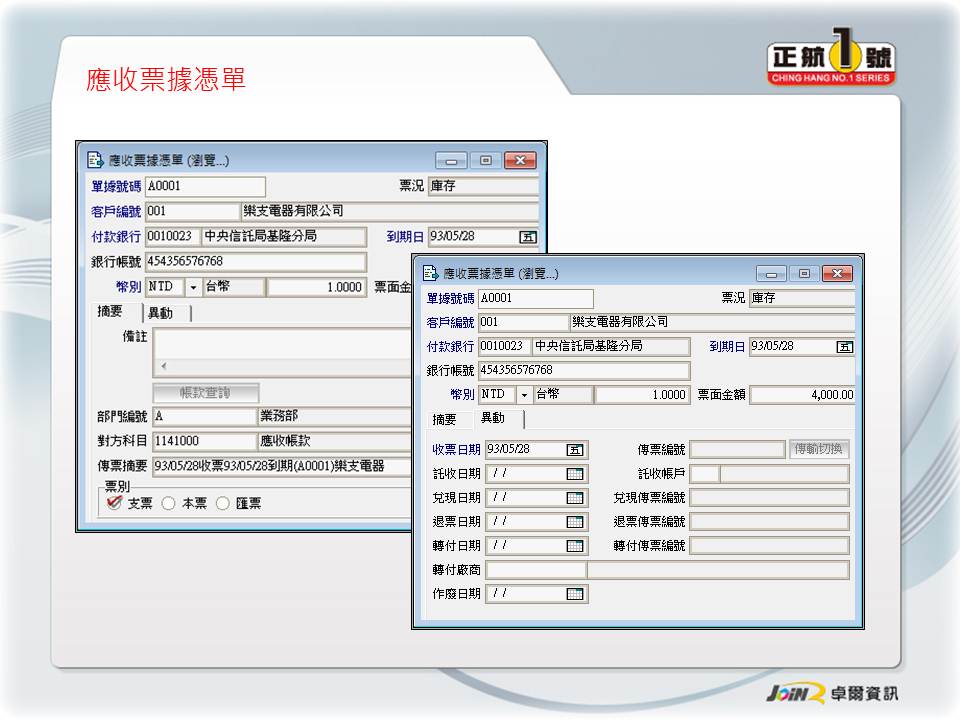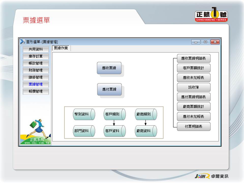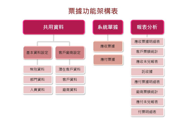 客戶廠商管理 票據收付管理 應付票據分析 應收票據分析 結合會計系統 結合帳款沖銷 |