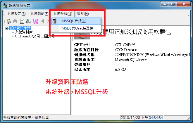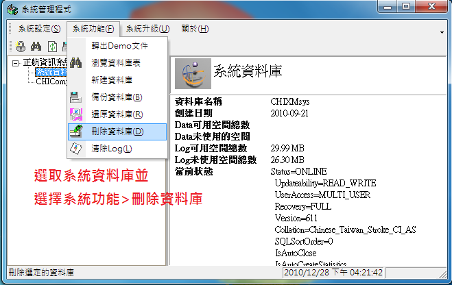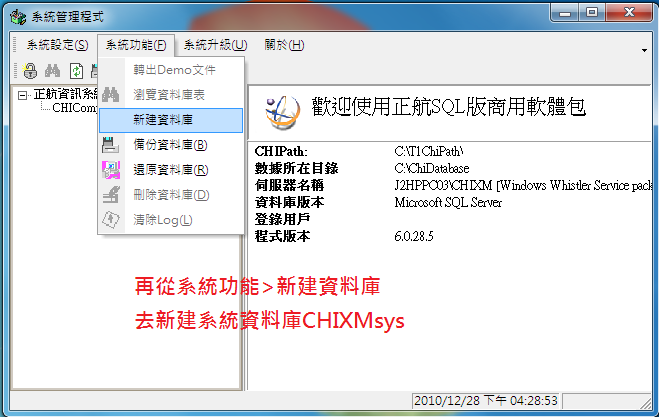 步驟二:進入系統管理(For T1) 刪除chixmsys 並重建。