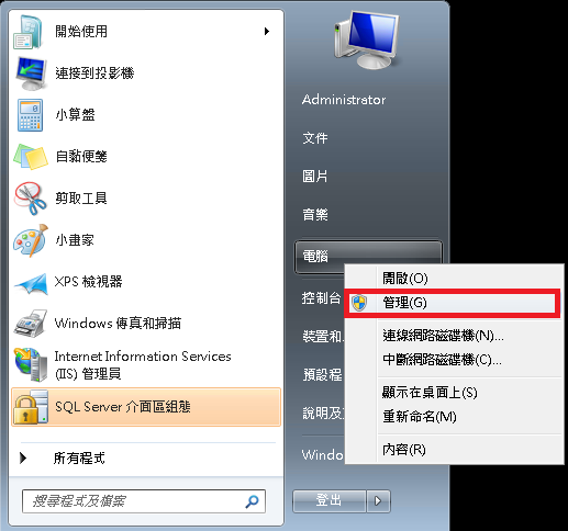 在右邊的服務列找到 SQL Server (Chixm) 確認他的狀態為已啟動