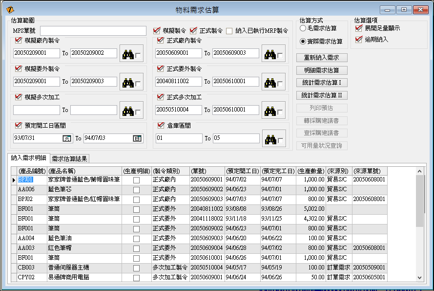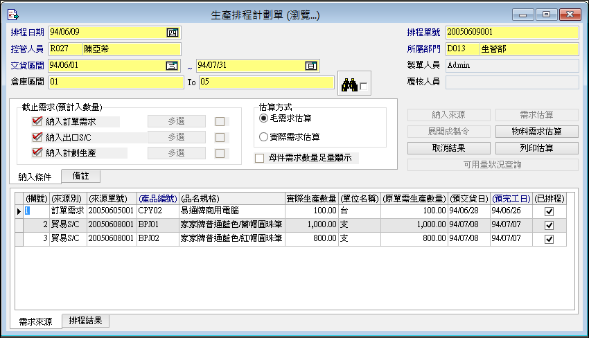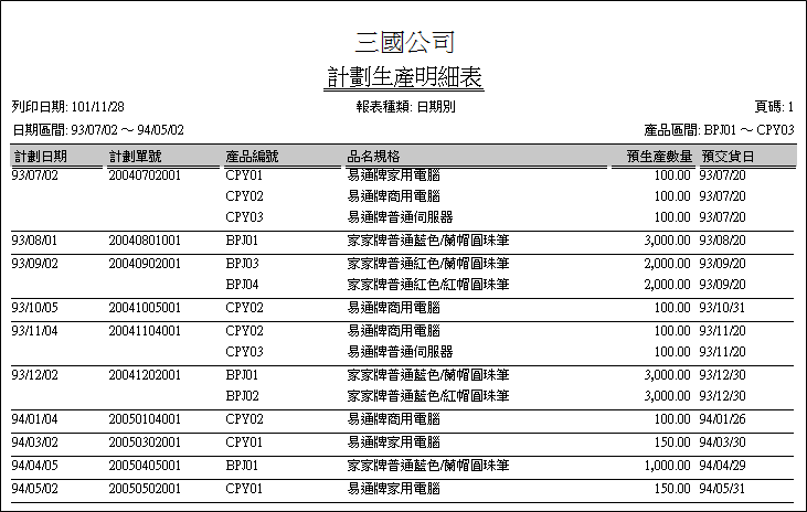 ▋計畫生產明細表