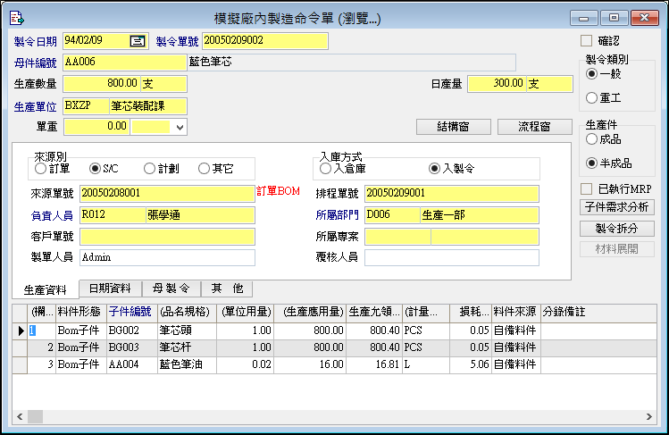 ▋模擬廠內製造命令單