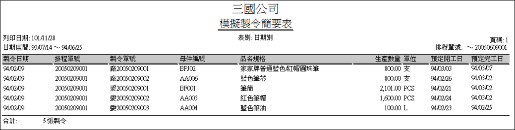 ▋模擬製令簡要表