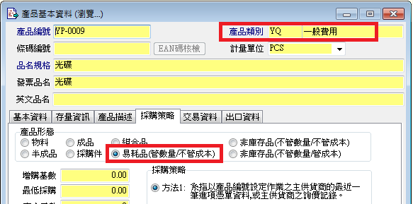 1. 該品項於產品基本資料建立後,於產品形態選擇為易耗品 ( 管數量\不管成本 )