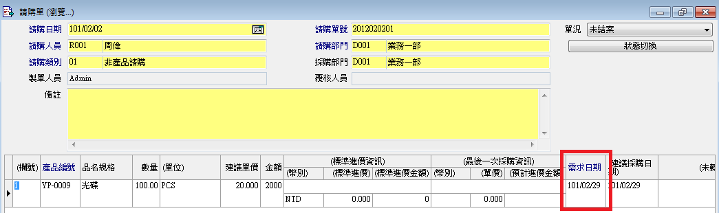 3. 登打請購單,輸入請購日期、請購人員及需求日期等相關資訊