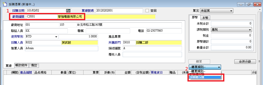 採購單 à新增 à選擇廠商 à轉單à請購轉採購