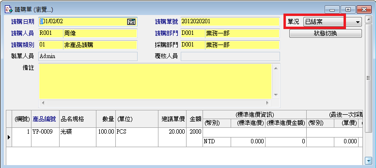 5. 此時當請購單上所有品項及數量全數轉至採購單後,請購單單況將變成已結案