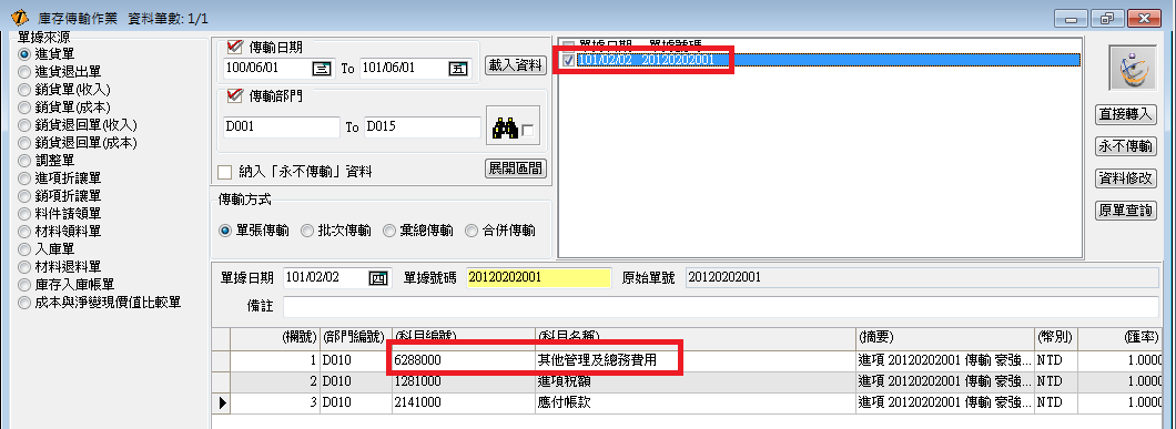 6. 將進貨單傳輸至財務,產生傳票,分錄如下: