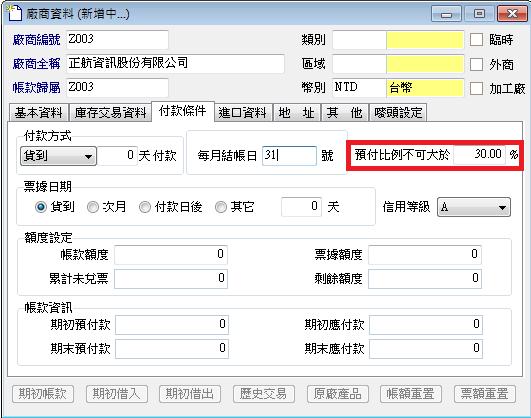 廠商資料中設置預付比例不可大於30%