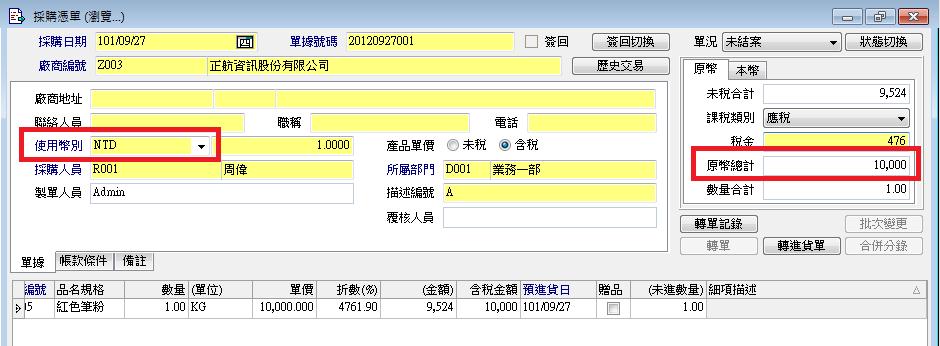 如: 廠商Z001 採購單原幣總計為10,000 TWD