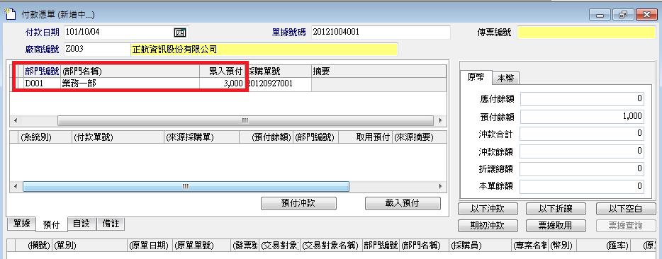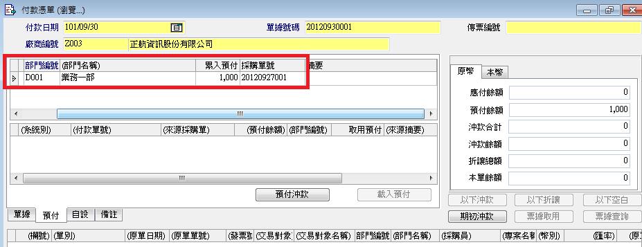 付款單關聯Z001採購單預付了1,000TWD