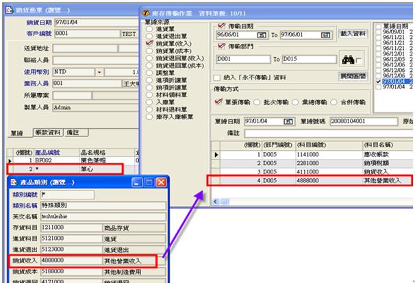 1. 當登打銷貨單時,如遇沒有產品編號的產品,可使用「*」,則在傳輸傳票時,即會以產品類別上「*」的會計科目帶出其會計科目。