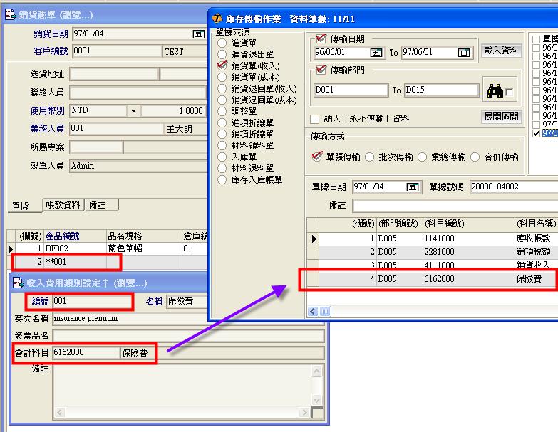 2. 當登打銷貨單時,如遇有費用時,則可使用「**」加上「收入費用類別」,則在傳輸傳票時,即會以收入費用類別上的會計科目帶出其會計科目。