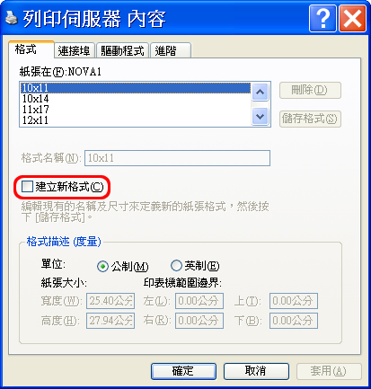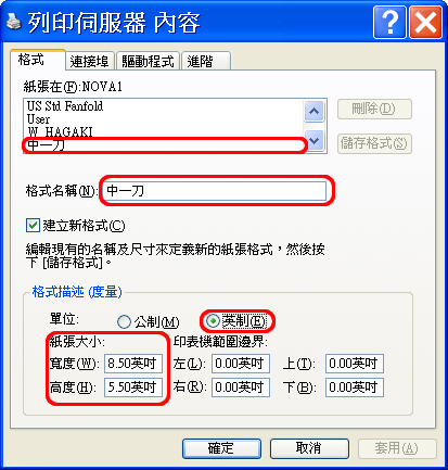 4.格式名稱輸入中一』→格式描述選擇英制→紙張大小選擇寬度8.50吋、高度5.50吋,設定完成之後選擇確定。