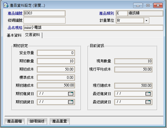 若您的系統在上線前就已有產品庫存,則請於下圖中的產品資料設定輸入期初數量&期初成本;系統將會為您算出該產品的期初總成本,如此系統才會將您原有的產品成本和往後的成本作整合