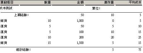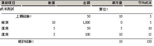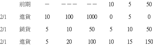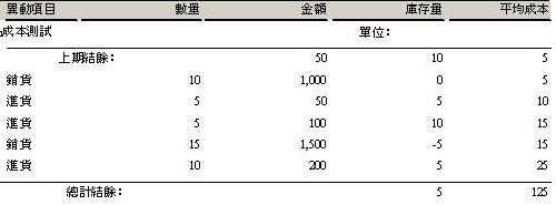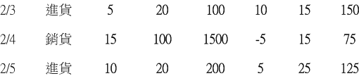備註:2/5的現行平均成本正確應該是200但由於上期的總成本為-75所以變成200-75=125;125/5=25得出平均成本為25的錯誤數值,雖然以數學計算上來看是對的但以成本的觀念來看,25元無疑是錯的。