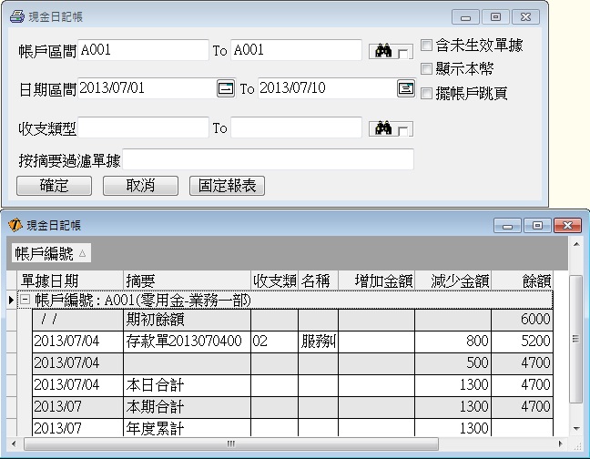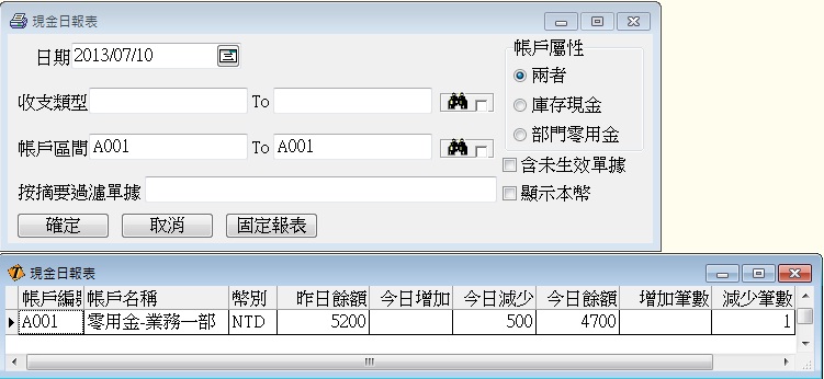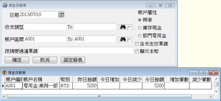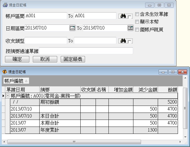 d. 報表 \ 財務管理 \ 現金對帳款表 \ 現金日記帳:可以透過此張報表來查看零用金每次增減的金額