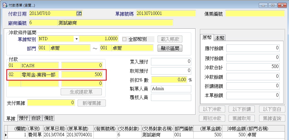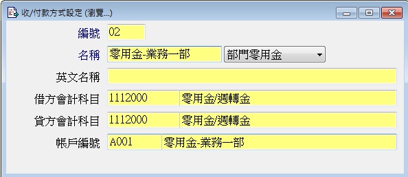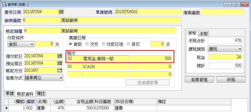 a. Ex:在費用的帳款資料頁簽中選擇零用金的收 \ 付款方式,登打現付的金額