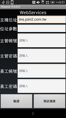 進入設定畫面後,會自動幫您連上測試電腦,在輸入主管、員工帳密前,請點擊「測試連線」,以確認手機與測試電腦是否連結成功。確定連線成功後,接著輸入主管和員工的帳密並點擊「驗證」按鈕,您就可順利與測試電腦的正航連結上了,主管和員工的測試帳密分別如下,