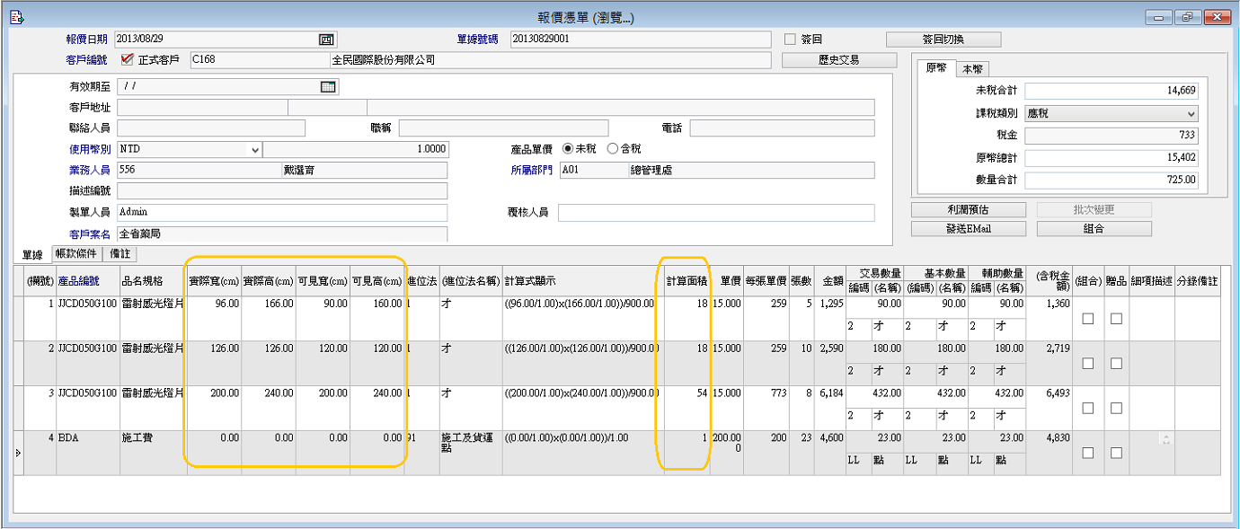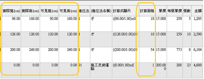 ▋功能說明 專案說明:因應企業於商品管理需要以材積計算,來對其客戶報價並依此作為庫存的管理,所制定的一套管理方案 適用的行業:可利用於大圖輸出業,玻璃產業,壁紙窗簾業, 功能範圍:報價單/訂購單/銷貨單/採購單 以上各單據之表身欄位提供了,實際寬/實際高/可見寬/可見高/面積計算/張數/單價/每張單價/金額