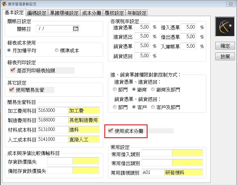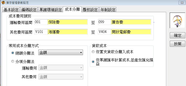 (3) 設定成本分攤參數:當勾選使用成本分攤功並存檔,再次開啟庫存參數即會成本分攤的參數頁籤