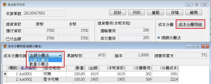 選擇總額分攤法,並點選成本分攤明細,設定運輸費用與其他費用要以金錢或數量單做為分攤依據。