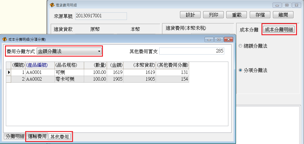 分項分攤法:各費用成本依分類(運輸費用、其他費用)選擇不同的分攤基準欄位來分攤費用金額,即各費用分別作分攤。
