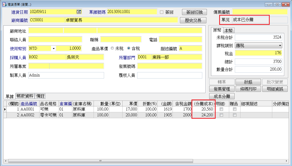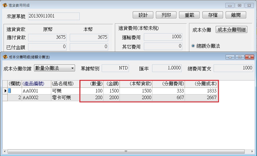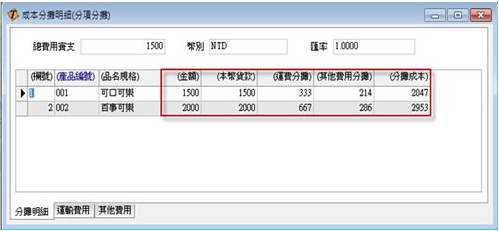 表身會有「分攤成本」欄位,表示產品分攤後的進貨成本。