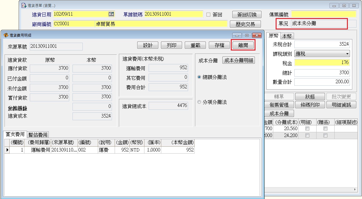 點擊離開便回到進貨單畫面。而進貨單單況會變成「成本未分攤」