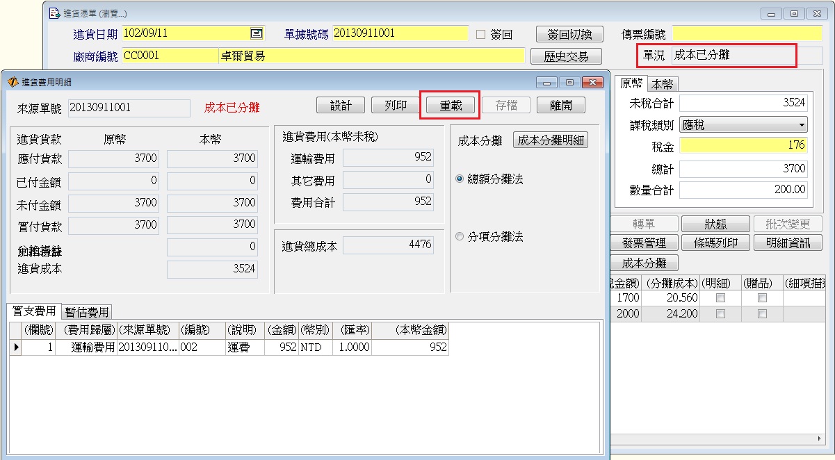 開啟已分攤的進貨單,點選成本分攤按鈕開啟分攤明細作業,接著點擊「重載」。系統便會自動清空