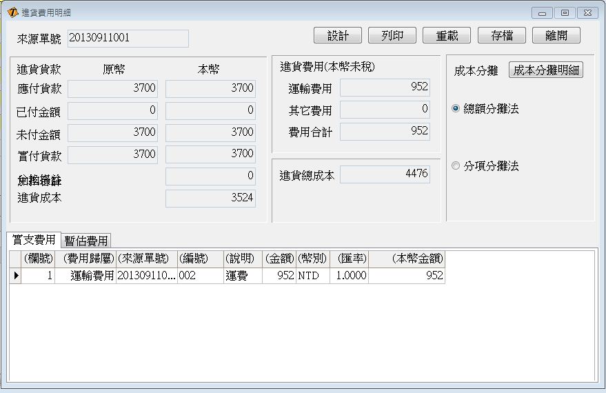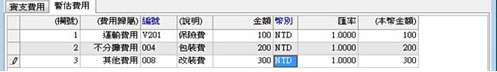 (2) 在進貨費用明細中,左邊列出進貨貨款,分原幣和本幣。中間列出下方表身關聯的費用金額及加總的進貨總成本,