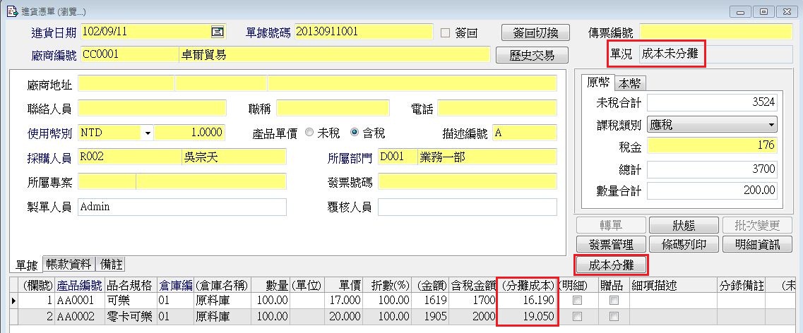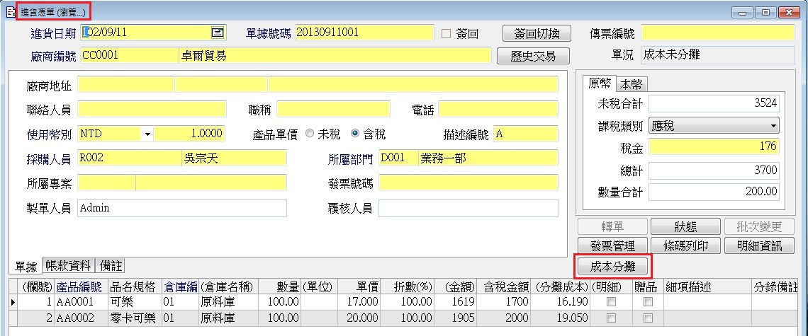 (1) 開啟進貨單,且在瀏覽狀態下點選「成本分攤」按鈕,開啟成本分攤功能。