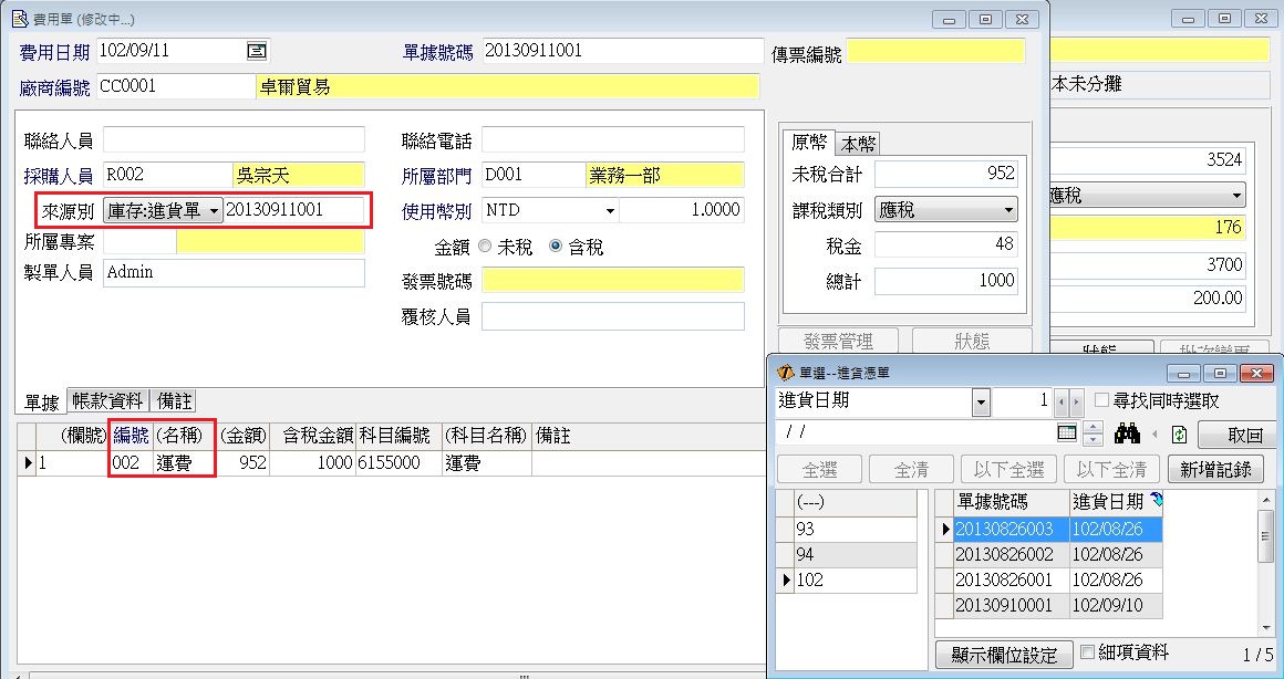 (2) 產生費用單,表頭來源別「來源別」需選擇庫存:進貨單,並選擇進貨單號。目的是要讓系統將進貨單與