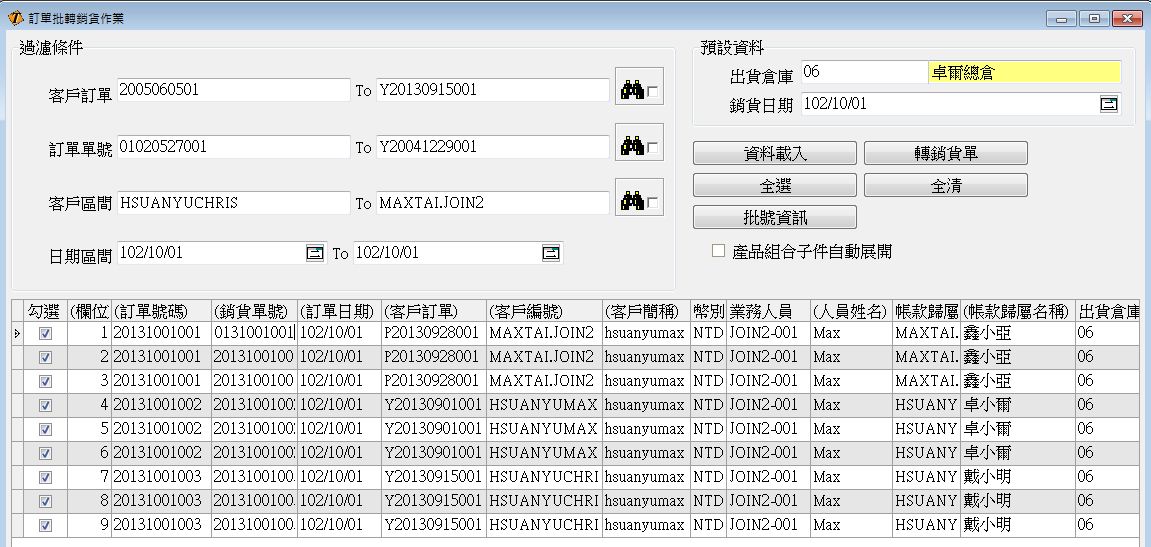 提供多種條件篩選,訂購單批次轉為銷貨單