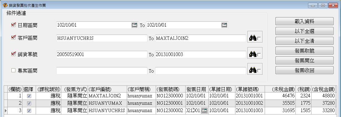 提供多種條件篩選,批次產生銷項發票