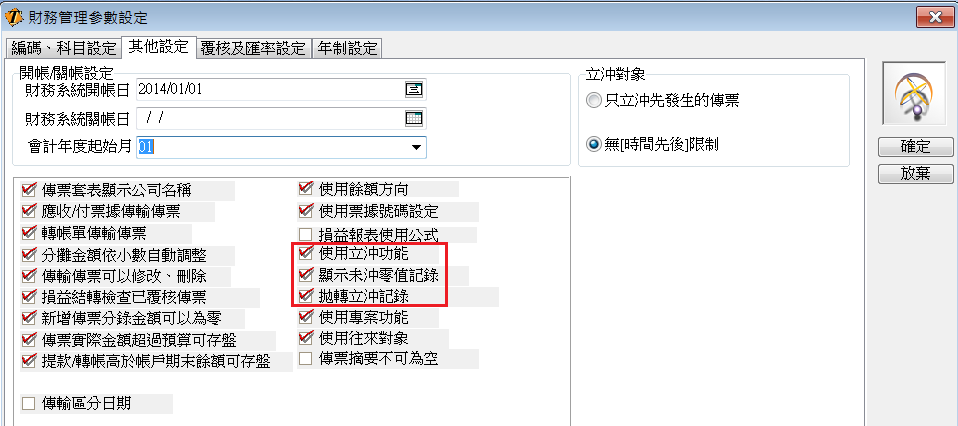 本設定僅在您勾選"使用立沖功能"時,才能進行設定。本設定主要針對傳票在執行立沖功能時,對於未沖金額為0的傳票分錄是否要列印出。舉例來說;若要立沖應收帳款,在進行立沖時,是否僅列出未完全立沖的帳款資料,或是不管是否立沖完成,所有資料均列出。若勾選,不論該科目未沖金額是否為0系統均將該科目相關分錄全部列出供您參考;若未勾選,當進行立沖時,系統僅列出該科目尚有未沖金額的傳票分錄供您沖帳用。
