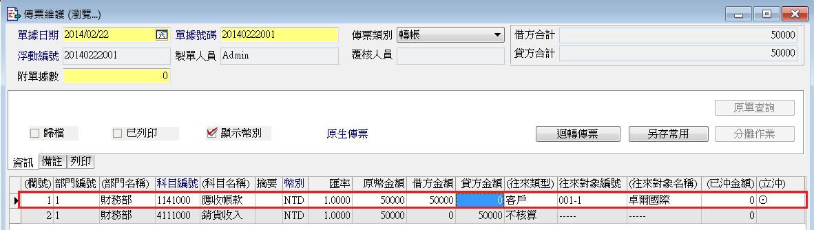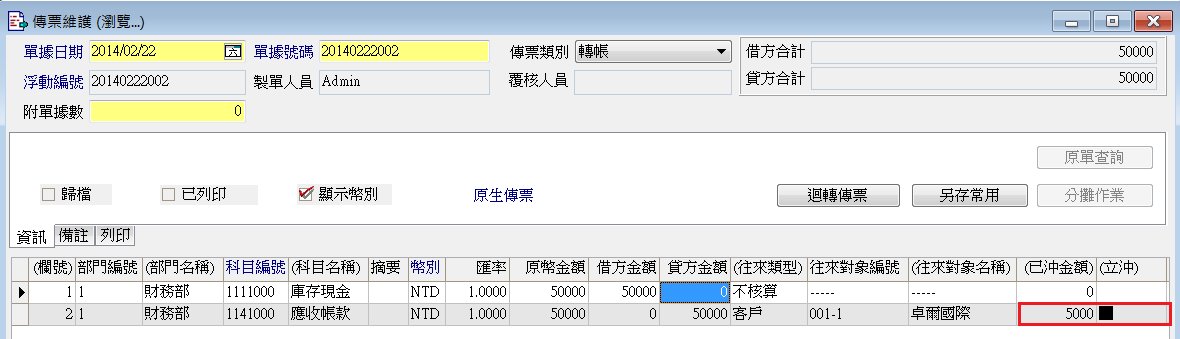 註:使用傳票分錄立沖,傳票需於新增或修改狀態下才能開啟立沖金額設定視窗。第一次執行立沖時,需點選分錄的借或貸方餘額開啟;已有立沖記錄的分錄,可於瀏覽狀態下滑鼠快點二下已沖金額欄位開啟。
