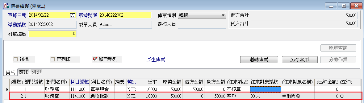 一、有兩筆傳票,分錄為「借:應收帳款50000;貸:銷貨收入50000」。