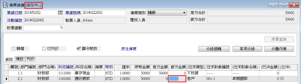 二、於第二筆傳票,點選修改,於貸方金額滑鼠快點二下,開出立沖金額設定。