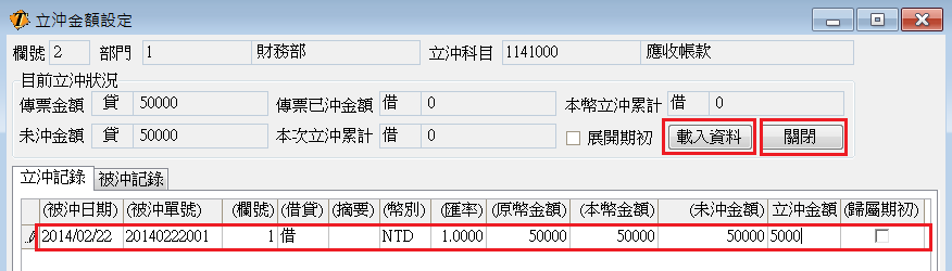 三、點選「載入資料」可將尚未立沖的傳票分錄載入,並輸入立沖金額,輸入完成點選「關閉」即完成立沖動作。