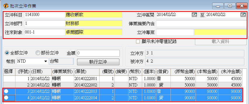 四、選取:在執行立沖之前,您必須先點選被沖分錄及沖銷各一筆,通常一筆為借,一筆為貸,以便進行立沖。