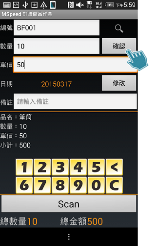 每當輸入完一筆資料按「確認」鍵即可新增資料,按返回鍵即可完成key單。