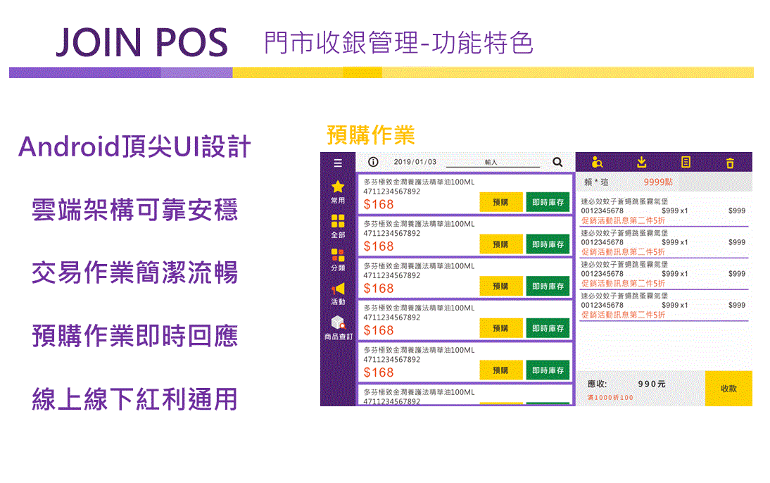 Android頂尖UI設計,雲端架構可靠安穩,交易作業簡潔流暢,線上線下紅利通用,整合ERP系統